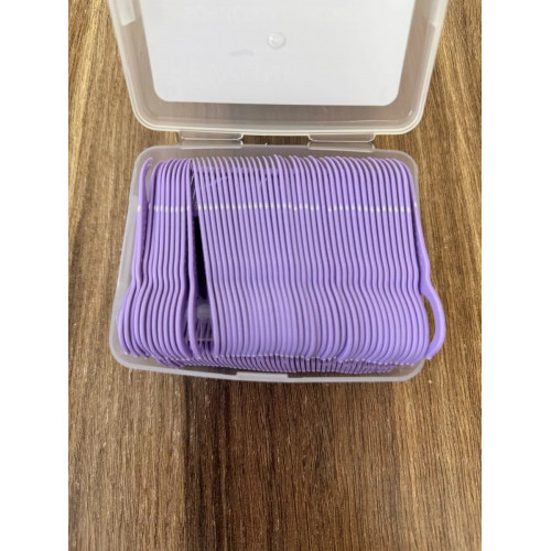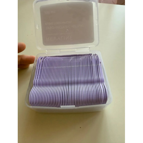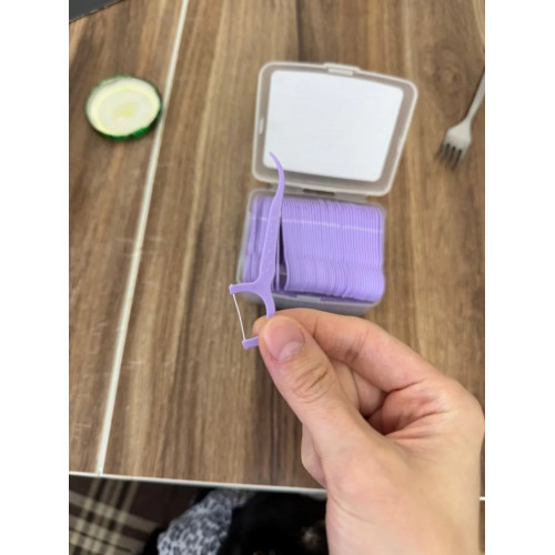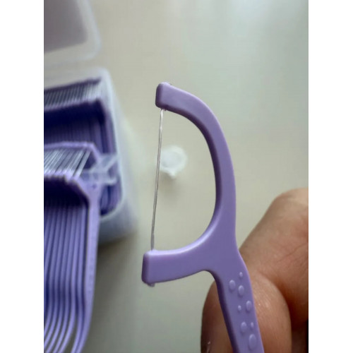 Удобные зубочистки в пластиковой коробочке для хранения. Каждая зубочистка надета на фиксирующие стержни, поэтому они лежат в коробке аккуратно. Нить на зубочистке прочная.